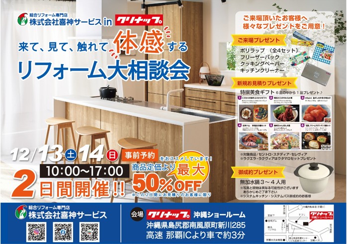 12月13日(土)・14日(日)には、クリナップ沖縄ショールームにて“リフォーム大相談会”も開催予定!