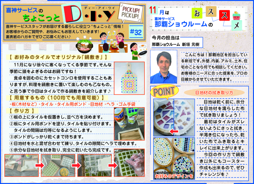 喜神サービススタッフがお届け!暮らしに関する“ちょこっと”情報!今月は冬にピッタリ✨オリジナル鍋敷きの作り方をご紹介しています!