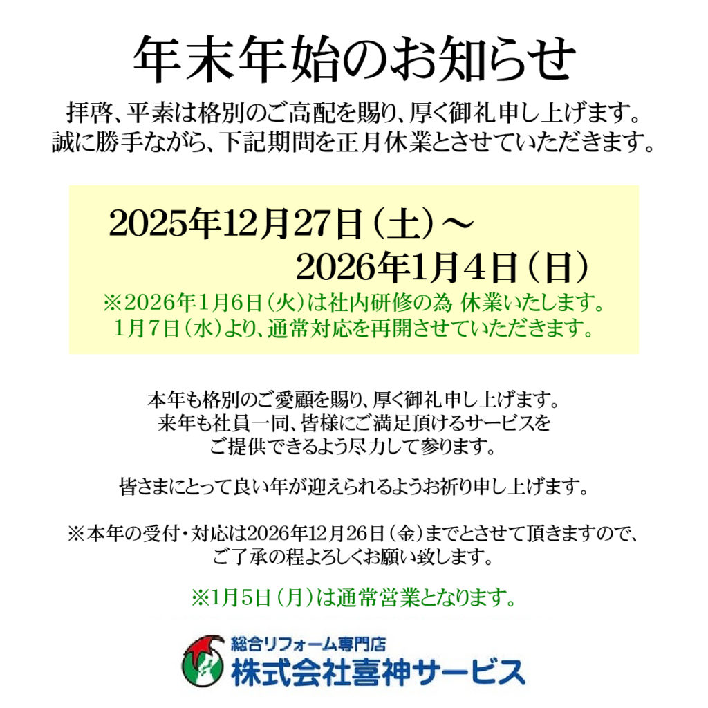 2025.12.23 年末年始のお休みをお知らせします。拝啓、平素は格別のご高配を賜り、厚く御礼申し上げます。 誠に勝手ながら、下記期間を正月休業とさせていただきます。 2025年12月27日(土)~2026年1月4日(日)まで ※2026年1月6日(火)は社内研修により休業いたします。 1月7日(水)より、通常対応を再開させていただきます。 本年も格別のご愛顧を賜り、厚く御礼申し上げます。 来年も社員一同、皆様にご満足頂けるサービスをご提供できるよう尽力して参ります。 皆さまにとって良い年が迎えられるようお祈り申し上げます。 ※本年の受付・対応は2026年12月26日(金)までとさせて頂きますので、ご了承の程よろしくお願い致します。 ※営業開始:1月5日(月)9時より通常営業となります。