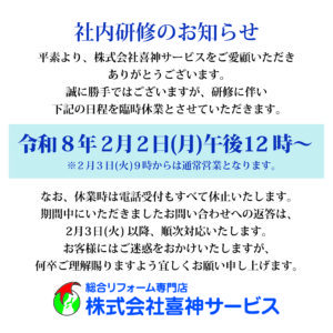 2026.2.2 社内研修のお知らせ平素より、株式会社喜神サービスをご愛顧いただきありがとうございます。