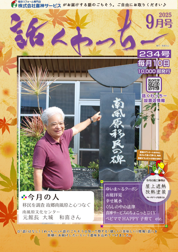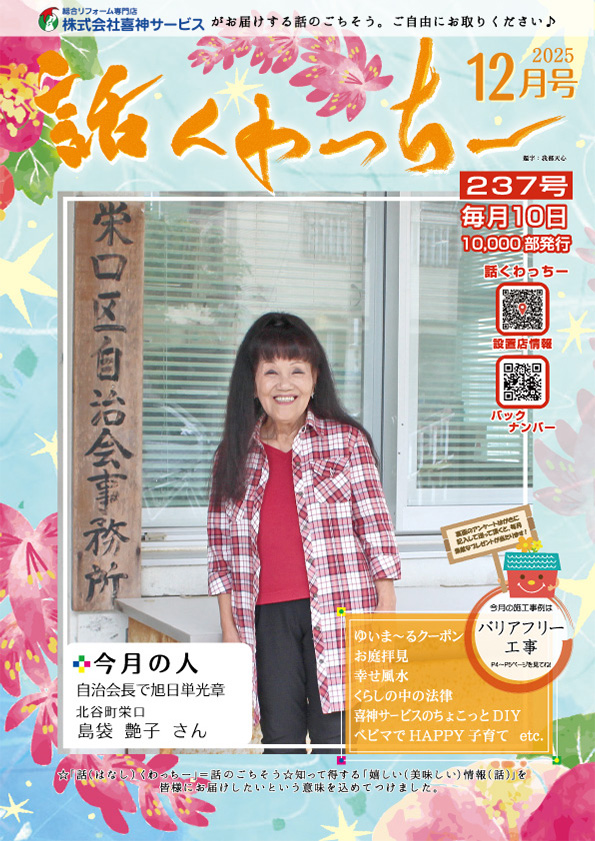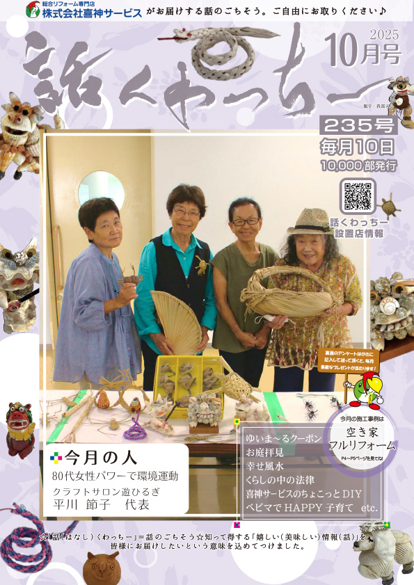 喜神サービスのフリーペーパー「話くわっちー」とは、毎月10日に発行している、暮らしの中のためになる話や不動産情報、お得なクーポンから、喜神サービスのフリーマーケット、イベント情報などを掲載しているフリーペーパーです。