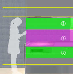 「①よく使うもの」は手の届く範囲に、「②時々使うもの」はその周りに、という具合に収納していきます。