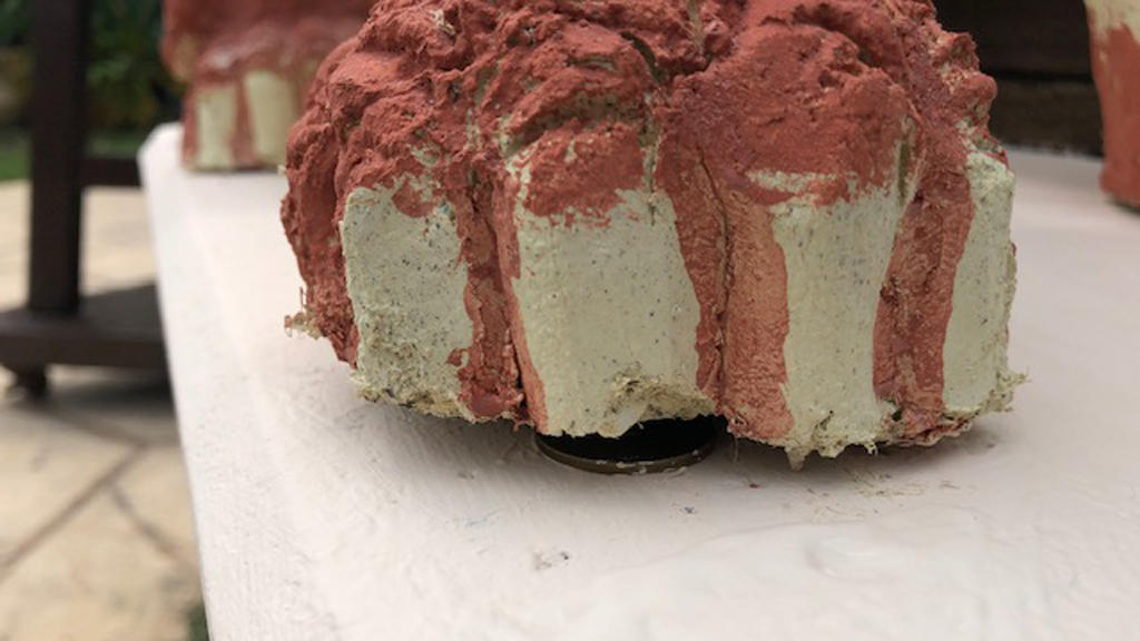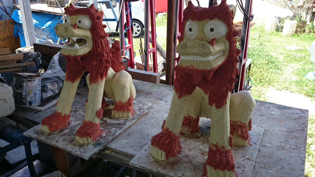 シーサー制作には漆喰を使用し、着色(赤)には赤瓦を粉末状にしたもので色付けしていきました。